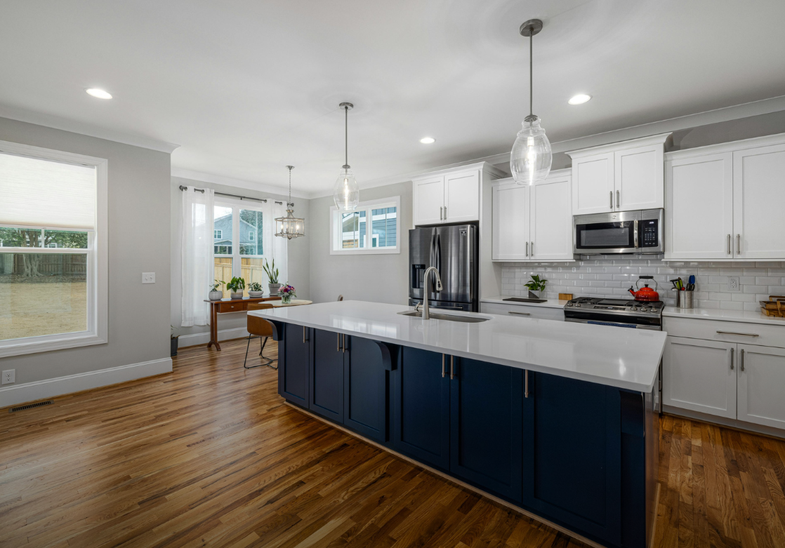 Instalación de iluminación bajo gabinetes, colgantes y cableado para electrodomésticos integrados.